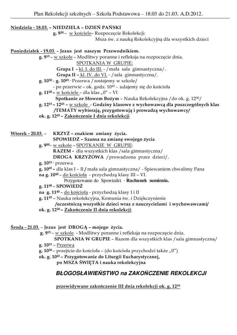 Od 18.03.2012 do 21.03.2012 w naszej szkole odbędą się Rekolekcje Wielkopostne. Kliknij na obrazek, aby zapoznać się ze szczegółowym planem zajęć w tych dniach.